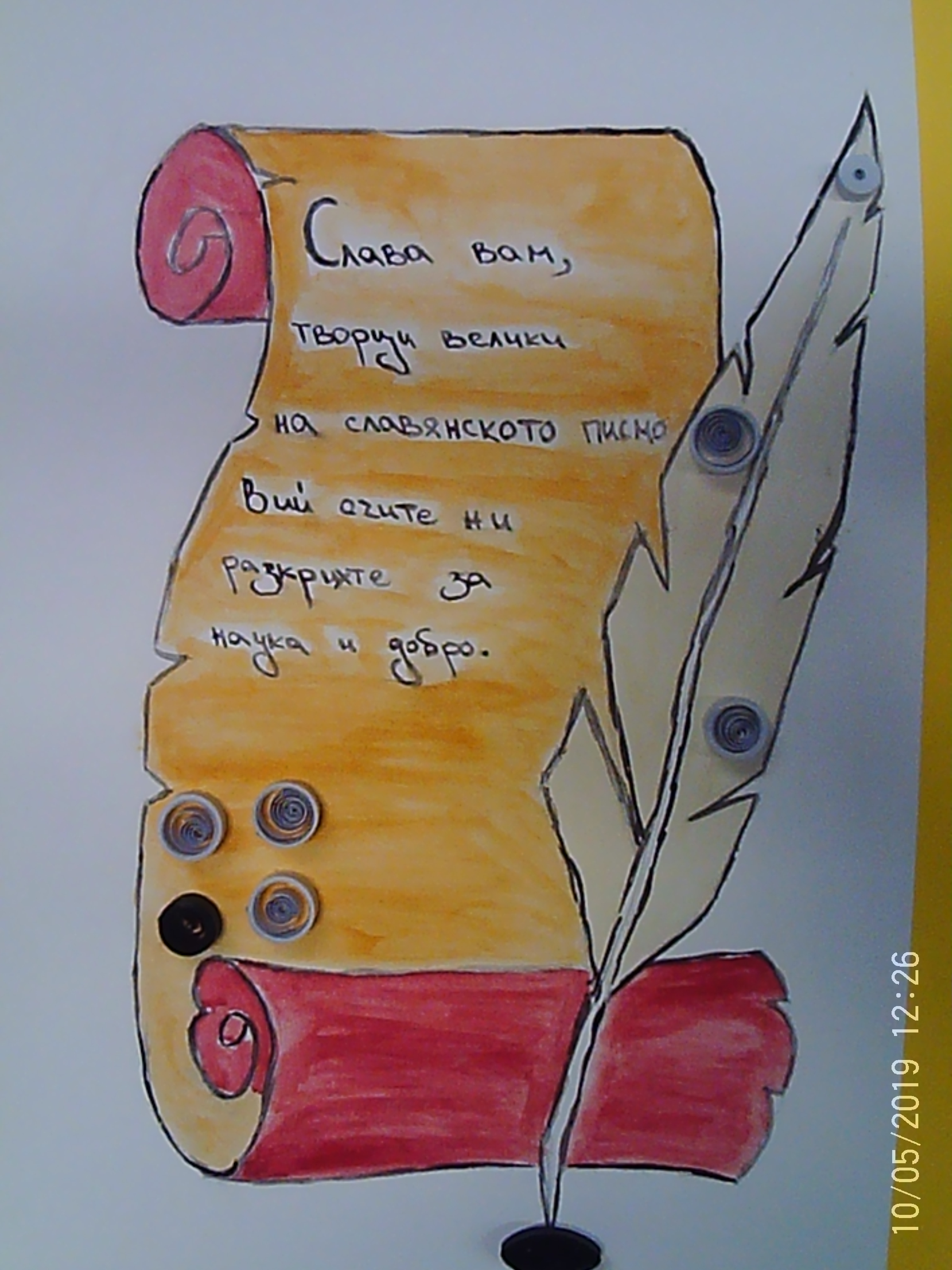 В експозицията могат да се видят художествени творби на подрастващи от различни възрасти, посветени на Празника на Просветителите и славянската писменост. Двадесет и пет произведения, изпълнени с различни изобразителни техники – цветна и черно-бяла графика, акварел, квилинг, колаж, апликация – разкриват пиетета на децата към делото на Първоучителите. В работите на учениците с когнитивни нарушения се включват и елементи на арттерапия.