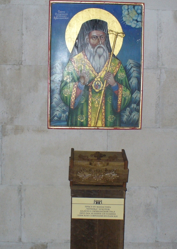 Икона на свети Софроний епископ Врачански и пръст от манастира "Черника" в Букурещ, където е свещенодействал през последните си години.
